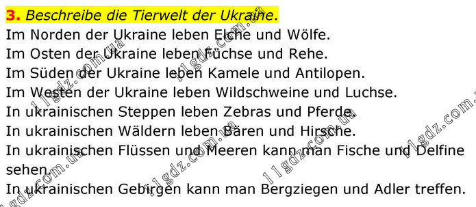 Beschreibe die Tierwelt der Ukraine. Im Norden der Ukraine leben Elche und Wölfe. Im Osten der Ukraine leben Füchse und Rehe. Im Süden der Ukraine leben Kamele und Antilopen. Im Westen der Ukraine leben Wildschweine und Luchse. In ukrainischen Steppen leben Zebras und Pferde. In ukrainischen Wäldern leben Bären und Hirsche. In ukrainischen Flüssen und Meeren kann man Fische und Delfine sehen. In ukrainischen Gebirgen kann man Bergziegen und Adler treffen.