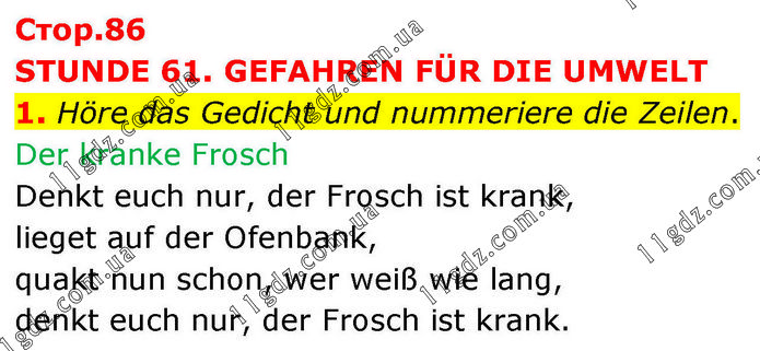 STUNDE 61. GEFAHREN FÜR DIE UMWELT 1. Höre das Gedicht und nummeriere die Zeilen. Der kranke Frosch Denkt euch nur, der Frosch ist krank, lieget auf der Ofenbank, quakt nun schon, wer weiß wie lang, denkt euch nur, der Frosch ist krank.
