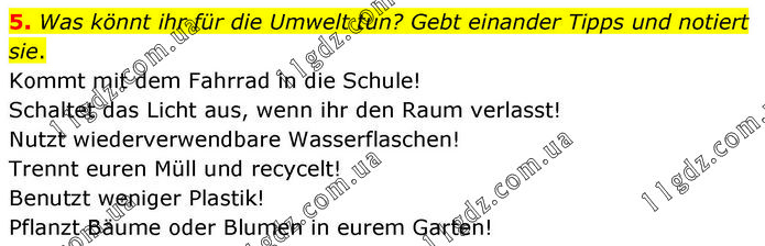 Was könnt ihr für die Umwelt tun? Gebt einander Tipps und notiert sie. Kommt mit dem Fahrrad in die Schule! Schaltet das Licht aus, wenn ihr den Raum verlasst! Nutzt wiederverwendbare Wasserflaschen! Trennt euren Müll und recycelt! Benutzt weniger Plastik! Pflanzt Bäume oder Blumen in eurem Garten!