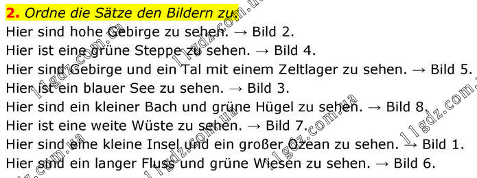Ordne die Sätze den Bildern zu. Hier sind hohe Gebirge zu sehen. → Bild 2. Hier ist eine grüne Steppe zu sehen. → Bild 4. Hier sind Gebirge und ein Tal mit einem Zeltlager zu sehen. → Bild 5. Hier ist ein blauer See zu sehen. → Bild 3. Hier sind ein kleiner Bach und grüne Hügel zu sehen. → Bild 8. Hier ist eine weite Wüste zu sehen. → Bild 7. Hier sind eine kleine Insel und ein großer Ozean zu sehen. → Bild 1. Hier sind ein langer Fluss und grüne Wiesen zu sehen. → Bild 6.