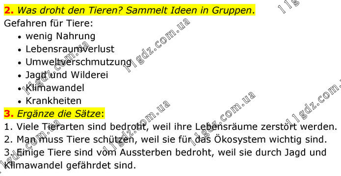 2. Was droht den Tieren? Sammelt Ideen in Gruppen. Gefahren für Tiere: • wenig Nahrung • Lebensraumverlust • Umweltverschmutzung • Jagd und Wilderei • Klimawandel • Krankheiten 3. Ergänze die Sätze: 1. Viele Tierarten sind bedroht, weil ihre Lebensräume zerstört werden. 2. Man muss Tiere schützen, weil sie für das Ökosystem wichtig sind. 3. Einige Tiere sind vom Aussterben bedroht, weil sie durch Jagd und Klimawandel gefährdet sind.
