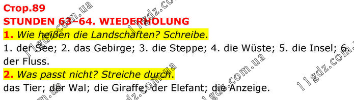 STUNDEN 63–64. WIEDERHOLUNG 1. Wie heißen die Landschaften? Schreibe. 1. der See; 2. das Gebirge; 3. die Steppe; 4. die Wüste; 5. die Insel; 6. der Fluss. 2. Was passt nicht? Streiche durch. das Tier; der Wal; die Giraffe; der Elefant; die Anzeige.