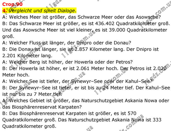 Vergleicht und spielt Dialoge. A: Welches Meer ist größer, das Schwarze Meer oder das Asowsche? B: Das Schwarze Meer ist größer, es ist 436.402 Quadratkilometer groß. Und das Asowsche Meer ist viel kleiner, es ist 39.000 Quadratkilometer groß. A: Welcher Fluss ist länger, der Dnipro oder die Donau? B: Die Donau ist länger, sie ist 2.857 Kilometer lang. Der Dnipro ist 2.201 Kilometer lang. A: Welcher Berg ist höher, der Howerla oder der Petros? B: Der Howerla ist höher, er ist 2.061 Meter hoch. Der Petros ist 2.020 Meter hoch. A: Welcher See ist tiefer, der Synewyr–See oder der Kahul–See? B: Der Synewyr–See ist tiefer, er ist bis zu 24 Meter tief. Der Kahul–See ist nur bis zu 7 Meter tief. A: Welches Gebiet ist größer, das Naturschutzgebiet Askania Nowa oder das Biosphärenreservat Karpaten? B: Das Biosphärenreservat Karpaten ist größer, es ist 570 Quadratkilometer groß. Das Naturschutzgebiet Askania Nowa ist 333 Quadratkilometer groß.