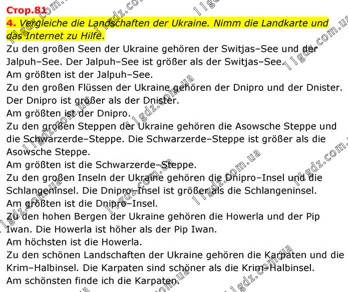 Vergleiche die Landschaften der Ukraine. Nimm die Landkarte und das Internet zu Hilfe. Zu den großen Seen der Ukraine gehören der Switjas–See und der Jalpuh–See. Der Jalpuh–See ist größer als der Switjas–See. Am größten ist der Jalpuh–See. Zu den großen Flüssen der Ukraine gehören der Dnipro und der Dnister. Der Dnipro ist größer als der Dnister. Am größten ist der Dnipro. Zu den großen Steppen der Ukraine gehören die Asowsche Steppe und die Schwarzerde–Steppe. Die Schwarzerde–Steppe ist größer als die Asowsche Steppe. Am größten ist die Schwarzerde–Steppe. Zu den großen Inseln der Ukraine gehören die Dnipro–Insel und die Schlangeninsel. Die Dnipro–Insel ist größer als die Schlangeninsel. Am größten ist die Dnipro–Insel. Zu den hohen Bergen der Ukraine gehören die Howerla und der Pip Iwan. Die Howerla ist höher als der Pip Iwan. Am höchsten ist die Howerla. Zu den schönen Landschaften der Ukraine gehören die Karpaten und die Krim–Halbinsel. Die Karpaten sind schöner als die Krim–Halbinsel. Am schönsten finde ich die Karpaten.