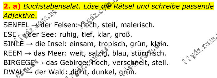 Buchstabensalat. Löse die Rätsel und schreibe passende Adjektive. SENFEL → der Felsen: hoch, steil, malerisch. ESE → der See: ruhig, tief, klar, groß. SINLE → die Insel: einsam, tropisch, grün, klein. REEM → das Meer: weit, salzig, blau, stürmisch. BIRGEGE → das Gebirge: hoch, verschneit, steil. DWAL → der Wald: dicht, dunkel, grün.