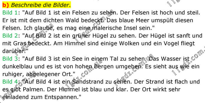 Beschreibe die Bilder. Bild 1: "Auf Bild 1 ist ein Felsen zu sehen. Der Felsen ist hoch und steil. Er ist mit dem dichten Wald bedeckt. Das blaue Meer umspült diesen Felsen. Ich glaube, es mag eine malerische Insel sein." Bild 2: "Auf Bild 2 ist ein grüner Hügel zu sehen. Der Hügel ist sanft und mit Gras bedeckt. Am Himmel sind einige Wolken und ein Vogel fliegt darüber." Bild 3: "Auf Bild 3 ist ein See in einem Tal zu sehen. Das Wasser ist dunkelblau und es ist von hohen Bergen umgeben. Es sieht aus wie ein ruhiger, abgelegener Ort." Bild 4: "Auf Bild 4 ist ein Sandstrand zu sehen. Der Strand ist flach und es gibt Palmen. Der Himmel ist blau und klar. Der Ort wirkt sehr einladend zum Entspannen."