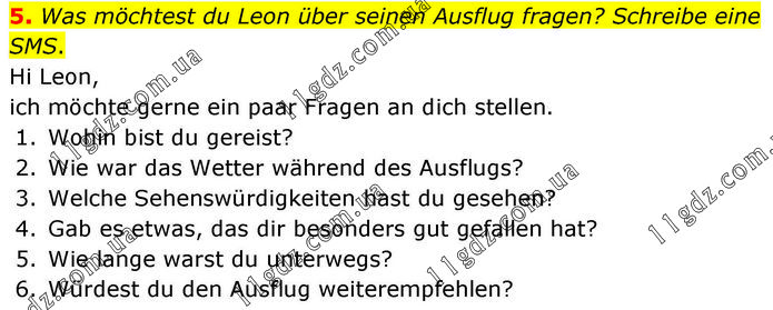 5. Was möchtest du Leon über seinen Ausflug fragen? Schreibe eine SMS. Hi Leon, ich möchte gerne ein paar Fragen an dich stellen. 1. Wohin bist du gereist? 2. Wie war das Wetter während des Ausflugs? 3. Welche Sehenswürdigkeiten hast du gesehen? 4. Gab es etwas, das dir besonders gut gefallen hat? 5. Wie lange warst du unterwegs? 6. Würdest du den Ausflug weiterempfehlen?