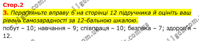 Перегляньте вправу 6 на сторінці 12 підручника й оцініть ваш рівень самозарадності за 12-бальною шкалою. побут – 10; навчання – 9; співпраця – 10; безпека – 7; здоров’я – 12.