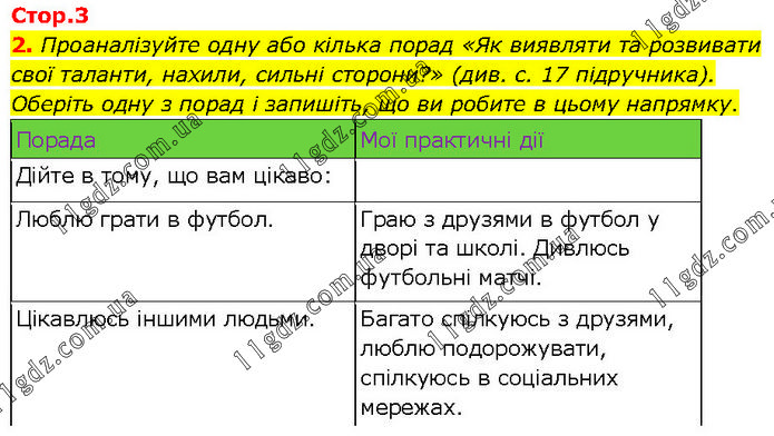 Проаналізуйте одну або кілька порад «Як виявляти та розвивати свої таланти, нахили, сильні сторони?» (див. с. 17 підручника). Оберіть одну з порад і запишіть, що ви робите в цьому напрямку. Порада Мої практичні дії Дійте в тому, що вам цікаво: Люблю грати в футбол. Граю з друзями в футбол у дворі та школі. Дивлюсь футбольні матчі. Цікавлюсь іншими людьми. Багато спілкуюсь з друзями, люблю подорожувати, спілкуюсь в соціальних мережах.