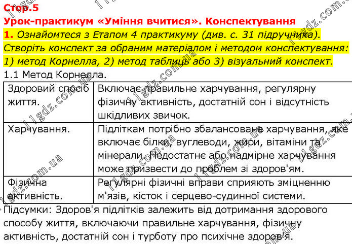 Урок-практикум «Уміння вчитися». Конспектування 1. Ознайомтеся з Етапом 4 практикуму (див. с. 31 підручника). Створіть конспект за обраним матеріалом і методом конспектування: 1) метод Корнелла, 2) метод таблиць або 3) візуальний конспект. 1.1 Метод Корнелла. Здоровий спосіб життя. Включає правильне харчування, регулярну фізичну активність, достатній сон і відсутність шкідливих звичок. Харчування. Підліткам потрібно збалансоване харчування, яке включає білки, вуглеводи, жири, вітаміни та мінерали. Недостатнє або надмірне харчування може призвести до проблем зі здоров'ям. Фізична активність. Регулярні фізичні вправи сприяють зміцненню м'язів, кісток і серцево-судинної системи. Підсумки: Здоров'я підлітків залежить від дотримання здорового способу життя, включаючи правильне харчування, фізичну активність, достатній сон і турботу про психічне здоров'я.