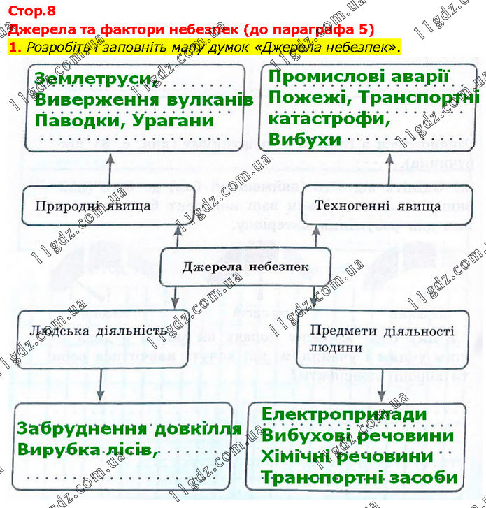 Джерела та фактори небезпек (до параграфа 5) 1. Розробіть і заповніть мапу думок «Джерела небезпек».