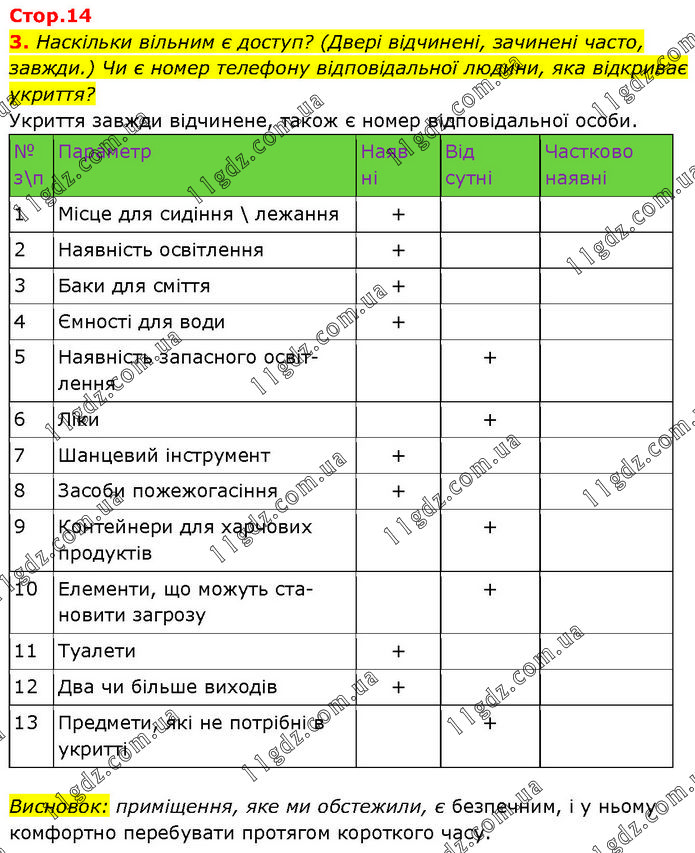 Наскільки вільним є доступ? (Двері відчинені, зачинені часто, завжди.) Чи є номер телефону відповідальної людини, яка відкриває укриття? Укриття завжди відчинене, також є номер відповідальної особи. Висновок: приміщення, яке ми обстежили, є безпечним, і у ньому комфортно перебувати протягом короткого часу.