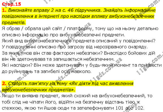 1. Виконайте вправу 2 на с. 46 підручника. Знайдіть інформаційне повідомлення в інтернеті про наслідки впливу вибухонебезпечних предметів. Я обрав / обрала цей сайт / платформу, тому що на ньому детально описано інформацію про вибухонебезпечні предмети. Який вид вибухонебезпечного предмета описаний у повідомленні? У повідомленні описано про загрозу від нерозірваного снаряду. За яких умов він став фактором небезпеки? Внаслідко бойових дій він не здетонувава та залишається небезпечним. Які наслідки? Він може здетонувати у будь-який момент та призвести до руйнувань та загибелі осіб навколо. 2. Створіть пам’ятку на тему «Як діяти під час виявлення вибухонебезпечних предметів». Якщо ти виявив предмет, який схожий на вибухонебезпечний, то тобі слід не чіпати його, відійти на безпечну відстань тією ж стежкою, якою ти йшов сюди та зателефонувати 101 або 102.