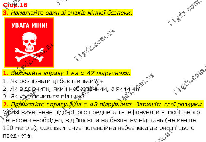 3. Намалюйте один зі знаків мінної безпеки. 1. Виконайте вправу 1 на с. 47 підручника. 1. Як розпізнати ці боєприпаси? 2. Як відрізнити, який небезпечний, а який ні? 3. Як убезпечитися від них? 2. Прочитайте вправу 2 на с. 48 підручника. Запишіть свої роздуми. У разі виявлення підозрілого предмета телефонувати з мобільного телефона необхідно, відійшовши на безпечну відстань (не менше 100 метрів), оскільки існує потенційна небезпека детонації цього предмета.
