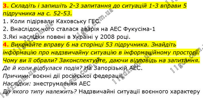 3. Складіть і запишіть 2-3 запитання до ситуацій 1-3 вправи 5 підручника на с. 52-53. 1. Коли підірвали Каховську ГЕС. 2. Внаслідок чого сталася аварія на АЕС Фукусіма-1 3.Які наслідки повені в Україні у 2008 році. 4. Виконайте вправу 6 на сторінці 53 підручника. Знайдіть інформацію про надзвичайну ситуацію в інформаційному просторі. Чому ви її обрали? Законспектуйте, даючи відповідь на запитання. Де й коли відбулася подія? На Запорізькій АЕС. Причини: воєнні дії російської федерації. Наслідки: знеструмлення АЕС До якого типу належить? Надзвичайні ситуації воєнного характеру