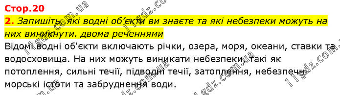 Запишіть, які водні об’єкти ви знаєте та які небезпеки можуть на них виникнути. двома реченнями Відомі водні об'єкти включають річки, озера, моря, океани, ставки та водосховища. На них можуть виникати небезпеки, такі як потоплення, сильні течії, підводні течії, затоплення, небезпечні морські істоти та забруднення води.