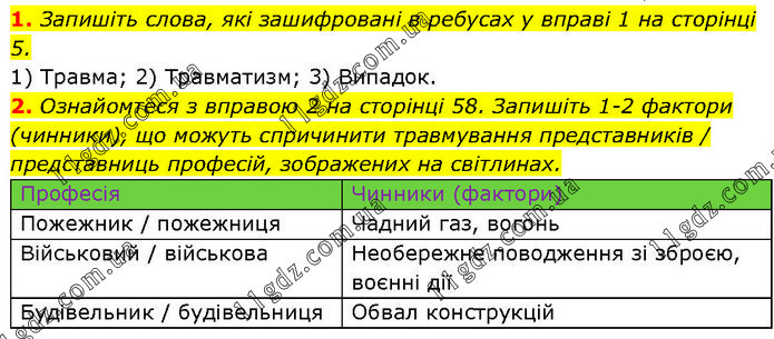 1. Запишіть слова, які зашифровані в ребусах у вправі 1 на сторінці 5. 1) Травма; 2) Травматизм; 3) Випадок. 2. Ознайомтеся з вправою 2 на сторінці 58. Запишіть 1-2 фактори (чинники), що можуть спричинити травмування представників / представниць професій, зображених на світлинах. Професія Чинники (фактори) Пожежник / пожежниця Чадний газ, вогонь Військовий / військова Необережне поводження зі зброєю, воєнні дії Будівельник / будівельниця Обвал конструкцій