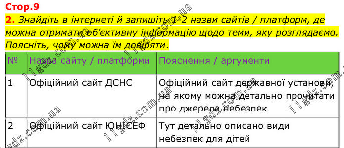Знайдіть в інтернеті й запишіть 1-2 назви сайтів / платформ, де можна отримати об’єктивну інформацію щодо теми, яку розглядаємо. Поясніть, чому можна їм довіряти. № Назва сайту / платформи Пояснення / аргументи 1 Офіційний сайт ДСНС Офіційний сайт державної установи, на якому можна детально прочитати про джерела небезпек 2 Офіційний сайт ЮНІСЕФ Тут детально описано види небезпек для дітей