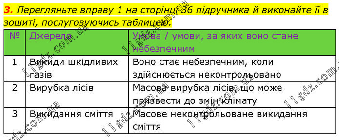 Перегляньте вправу 1 на сторінці 36 підручника й виконайте її в зошиті, послуговуючись таблицею. № Джерело Умова / умови, за яких воно стане небезпечним 1 Викиди шкідливих газів Воно стає небезпечним, коли здійснюється неконтрольовано 2 Вирубка лісів Масова вирубка лісів, що може призвести до змін клімату 3 Викидання сміття Масове неконтрольоване викидання сміття