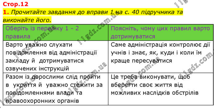 Прочитайте завдання до вправи 1 на с. 40 підручника та виконайте його. Оберіть із переліку 1 - 2 правила Поясніть, чому цих правил варто дотримуватися Варто уважно слухати повідомлення від адміністрації закладу й дотримуватися озвучених інструкцій Саме адміністрація контролює дії учнів і знає, як, куди і коли їм краще пересуватися Разом із дорослими слід пройти в укриття й уважно стежити за повідомленнями влади та правоохоронних органів Це треба виконувати, щоб вберегти своє життя від можливих наслідків обстрілів