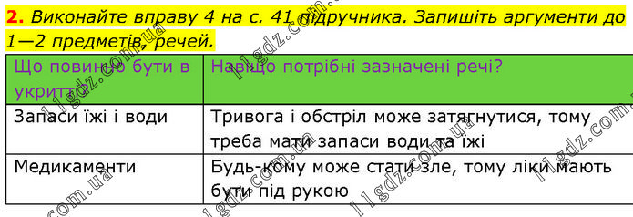 Виконайте вправу 4 на с. 41 підручника. Запишіть аргументи до 1—2 предметів, речей. Що повинно бути в укритті? Навіщо потрібні зазначені речі? Запаси їжі і води Тривога і обстріл може затягнутися, тому треба мати запаси води та їжі Медикаменти Будь-кому може стати зле, тому ліки мають бути під рукою