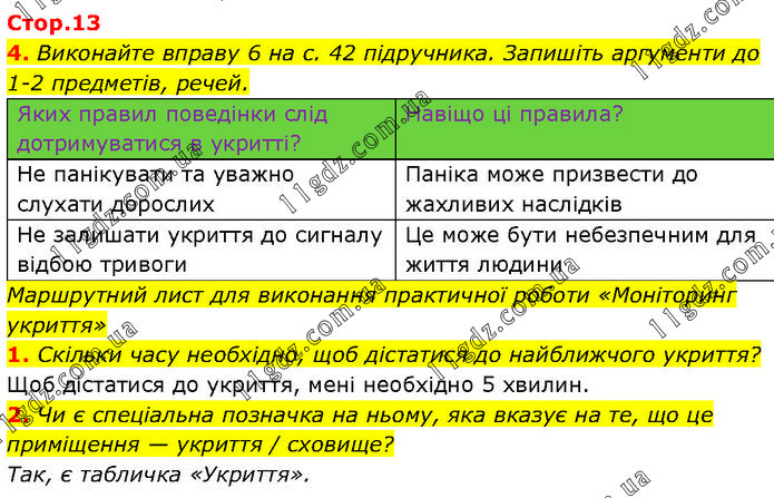 4. Виконайте вправу 6 на с. 42 підручника. Запишіть аргументи до 1-2 предметів, речей. Яких правил поведінки слід дотримуватися в укритті? Навіщо ці правила? Не панікувати та уважно слухати дорослих Паніка може призвести до жахливих наслідків Не залишати укриття до сигналу відбою тривоги Це може бути небезпечним для життя людини Маршрутний лист для виконання практичної роботи «Моніторинг укриття» 1. Скільки часу необхідно, щоб дістатися до найближчого укриття? Щоб дістатися до укриття, мені необхідно 5 хвилин. 2. Чи є спеціальна позначка на ньому, яка вказує на те, що це приміщення — укриття / сховище? Так, є табличка «Укриття».