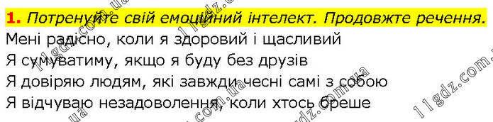Потренуйте свій емоційний інтелект. Продовжте речення. Мені радісно, коли я здоровий і щасливий. Я сумуватиму, якщо я буду без друзів. Я довіряю людям, які завжди чесні самі з собою. Я відчуваю незадоволення, коли хтось бреше.
