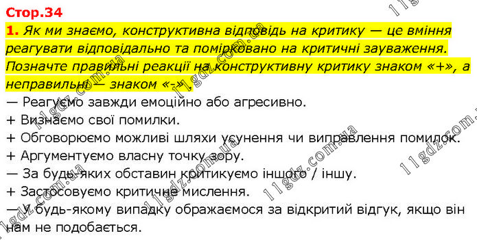 Як ми знаємо, конструктивна відповідь на критику — це вміння реагувати відповідально та помірковано на критичні зауваження. Позначте правильні реакції на конструктивну критику знаком «+», а неправильні — знаком «-» . — Реагуємо завжди емоційно або агресивно. + Визнаємо свої помилки. + Обговорюємо можливі шляхи усунення чи виправлення помилок. + Аргументуємо власну точку зору. — За будь-яких обставин критикуємо іншого / іншу. + Застосовуємо критичне мислення. — У будь-якому випадку ображаємося за відкритий відгук, якщо він нам не подобається.