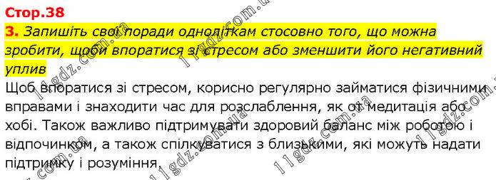 Запишіть свої поради одноліткам стосовно того, що можна зробити, щоби впоратися зі стресом або зменшити його негативний уплив Щоб впоратися зі стресом, корисно регулярно займатися фізичними вправами і знаходити час для розслаблення, як от медитація або хобі. Також важливо підтримувати здоровий баланс між роботою і відпочинком, а також спілкуватися з близькими, які можуть надати підтримку і розуміння.