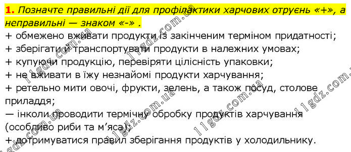 Позначте правильні дії для профілактики харчових отруєнь «+», а неправильні — знаком «-» . + обмежено вживати продукти із закінченим терміном придатності; + зберігати й транспортувати продукти в належних умовах; + купуючи продукцію, перевіряти цілісність упаковки; + не вживати в їжу незнайомі продукти харчування; + ретельно мити овочі, фрукти, зелень, а також посуд, столове приладдя; — інколи проводити термічну обробку продуктів харчування (особливо риби та м’яса); + дотримуватися правил зберігання продуктів у холодильнику.