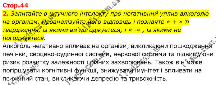 Запитайте в штучного інтелекту про негативний уплив алкоголю на організм. Проаналізуйте його відповідь і позначте « + » ті твердження, із якими ви погоджуєтеся, і « -» , із якими не погоджуєтеся. Алкоголь негативно впливає на організм, викликаючи пошкодження печінки, серцево-судинної системи, нервової системи та підвищуючи ризик розвитку залежності і різних захворювань. Також він може погіршувати когнітивні функції, знижувати імунітет і впливати на психічний стан, викликаючи депресію та тривожність.
