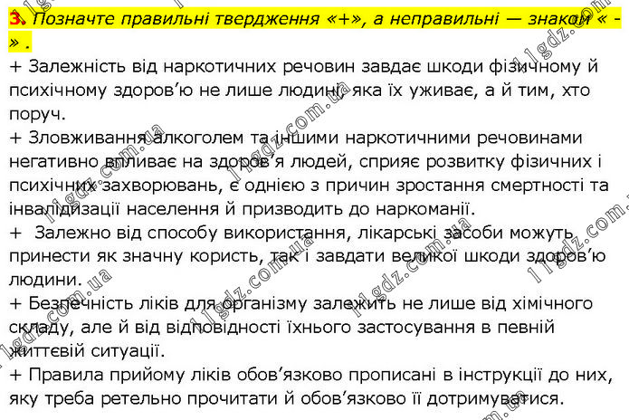 Позначте правильні твердження «+», а неправильні — знаком « -» . + Залежність від наркотичних речовин завдає шкоди фізичному й психічному здоров’ю не лише людині, яка їх уживає, а й тим, хто поруч. + Зловживання алкоголем та іншими наркотичними речовинами негативно впливає на здоров’я людей, сприяє розвитку фізичних і психічних захворювань, є однією з причин зростання смертності та інвалідизації населення й призводить до наркоманії. + Залежно від способу використання, лікарські засоби можуть принести як значну користь, так і завдати великої шкоди здоров’ю людини. + Безпечність ліків для організму залежить не лише від хімічного складу, але й від відповідності їхнього застосування в певній життєвій ситуації. + Правила прийому ліків обов’язково прописані в інструкції до них, яку треба ретельно прочитати й обов’язково її дотримуватися.