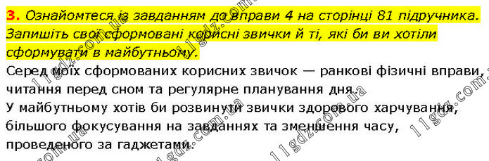 Ознайомтеся із завданням до вправи 4 на сторінці 81 підручника. Запишіть свої сформовані корисні звички й ті, які би ви хотіли сформувати в майбутньому. Серед моїх сформованих корисних звичок — ранкові фізичні вправи, читання перед сном та регулярне планування дня. У майбутньому хотів би розвинути звички здорового харчування, більшого фокусування на завданнях та зменшення часу, проведеного за гаджетами.