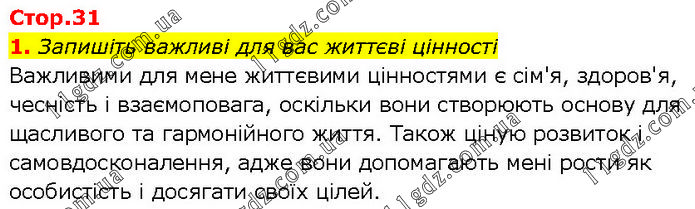 Запишіть важливі для вас життєві цінності Важливими для мене життєвими цінностями є сім'я, здоров'я, чесність і взаємоповага, оскільки вони створюють основу для щасливого та гармонійного життя. Також ціную розвиток і самовдосконалення, адже вони допомагають мені рости як особистість і досягати своїх цілей.