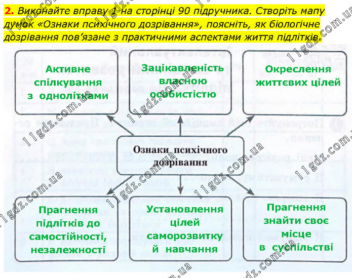 Виконайте вправу 1 на сторінці 90 підручника. Створіть мапу думок «Ознаки психічного дозрівання», поясніть, як біологічне дозрівання пов’язане з практичними аспектами життя підлітків.