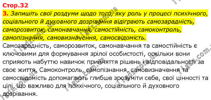 Запишіть свої роздуми щодо того, яку роль у процесі психічного, соціального й духовного дозрівання відіграють самозарадність, саморозвиток, самонавчання, самостійність, самоконтроль, самопізнання, самовизначення, самосвідомість. Самозарадність, саморозвиток, самонавчання та самостійність є ключовими для формування зрілої особистості, оскільки вони сприяють набуттю навичок прийняття рішень і відповідальності за своє життя. Самоконтроль, самопізнання, самовизначення та самосвідомість допомагають глибше зрозуміти себе, свої цінності та цілі, що важливо для психічного, соціального й духовного дозрівання.