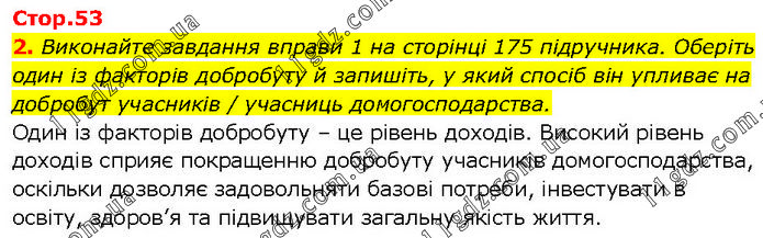 Виконайте завдання вправи 1 на сторінці 175 підручника. Оберіть один із факторів добробуту й запишіть, у який спосіб він упливає на добробут учасників / учасниць домогосподарства. Один із факторів добробуту – це рівень доходів. Високий рівень доходів сприяє покращенню добробуту учасників домогосподарства, оскільки дозволяє задовольняти базові потреби, інвестувати в освіту, здоров’я та підвищувати загальну якість життя.