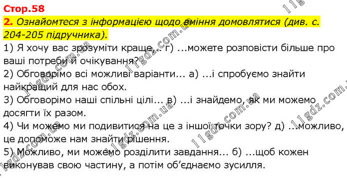 Ознайомтеся з інформацією щодо вміння домовлятися (див. с. 204-205 підручника). 1) Я хочу вас зрозуміти краще,.. г) ...можете розповісти більше про ваші потреби й очікування? 2) Обговорімо всі можливі варіанти... а) ...і спробуємо знайти найкращий для нас обох. 3) Обговорімо наші спільні цілі... в) ...і знайдемо, як ми можемо досягти їх разом. 4) Чи можемо ми подивитися на це з іншої точки зору? д) ...можливо, це допоможе нам знайти рішення. 5) Можливо, ми можемо розділити завдання... б) ...щоб кожен виконував свою частину, а потім об’єднаємо зусилля.