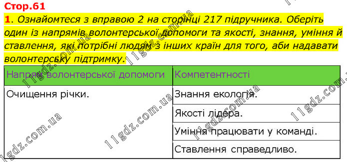 Ознайомтеся з вправою 2 на сторінці 217 підручника. Оберіть один із напрямів волонтерської допомоги та якості, знання, уміння й ставлення, які потрібні людям з інших країн для того, аби надавати волонтерську підтримку.