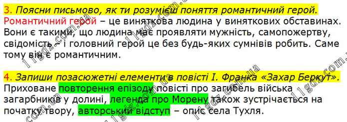 3. Поясни письмово, як ти розумієш поняття романтичний герой. 4. Запиши позасюжетні елементи в повісті І. Франка «Захар Беркут».