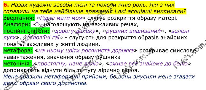 Назви художні засоби пісні та поясни їхню роль. Які з них справили на тебе найбільше враження і які асоціації викликали? «Пісня про рушник»