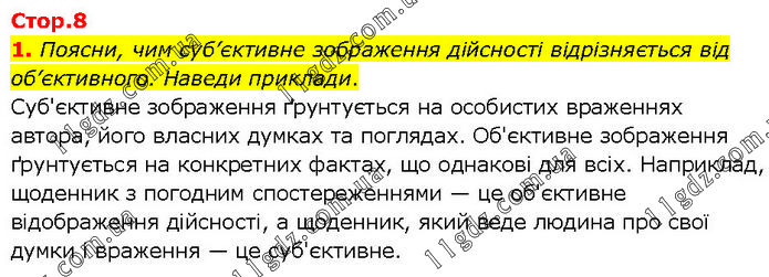Поясни, чим суб’єктивне зображення дійсності відрізняється від об’єктивного. Наведи приклади. Суб'єктивне зображення ґрунтується на особистих враженнях автора, його власних думках та поглядах. Об'єктивне зображення ґрунтується на конкретних фактах, що однакові для всіх. Наприклад, щоденник з погодним спостереженнями — це об'єктивне відображення дійсності, а щоденник, який веде людина про свої думки і враження — це суб'єктивне.