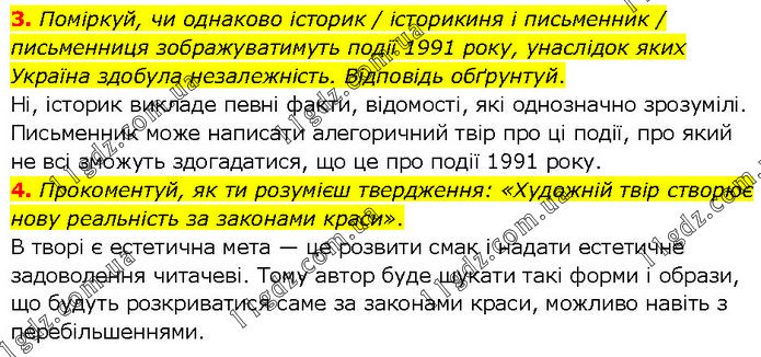 3. Поміркуй, чи однаково історик / історикиня і письменник / письменниця зображуватимуть події 1991 року, унаслідок яких Україна здобула незалежність. Відповідь обґрунтуй. Ні, історик викладе певні факти, відомості, які однозначно зрозумілі. Письменник може написати алегоричний твір про ці події, про який не всі зможуть здогадатися, що це про події 1991 року. 4. Прокоментуй, як ти розумієш твердження: «Художній твір створює нову реальність за законами краси». В творі є естетична мета — це розвити смак і надати естетичне задоволення читачеві. Тому автор буде шукати такі форми і образи, що будуть розкриватися саме за законами краси, можливо навіть з перебільшеннями.
