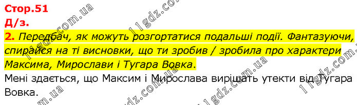 2. Передбач, як можуть розгортатися подальші події. Фантазуючи, спирайся на ті висновки, що ти зробив / зробила про характери Максима, Мирослави і Тугара Вовка. Мені здається, що Максим і Мирослава вирішать утекти від Тугара Вовка.
