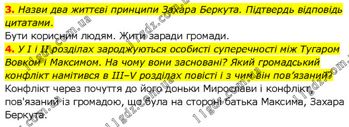 3. Назви два життєві принципи Захара Беркута. Підтвердь відповідь цитатами. Бути корисним людям. Жити заради громади. 4. У І і ІІ розділах зароджуються особисті суперечності між Тугаром Вовком і Максимом. На чому вони засновані? Який громадський конфлікт намітився в ІІІ–V розділах повісті і з чим він пов’язаний? Конфлікт через почуття до його доньки Мирослави і конфлікт, пов'язаний із громадою, що була на стороні батька Максима, Захара Беркута.