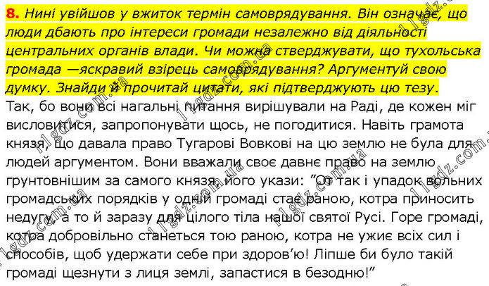 8. Нині увійшов у вжиток термін самоврядування. Він означає, що люди дбають про інтереси громади незалежно від діяльності центральних органів влади. Чи можна стверджувати, що тухольська громада —яскравий взірець самоврядування? Аргументуй свою думку. Знайди й прочитай цитати, які підтверджують цю тезу. Так, бо вони всі нагальні питання вирішували на Раді, де кожен міг висловитися, запропонувати щось, не погодитися. Навіть грамота князя, що давала право Тугарові Вовкові на цю землю не була для людей аргументом. Вони вважали своє давнє право на землю грунтовнішим за самого князя, його укази: ”От так і упадок вольних громадських порядків у одній громаді стає раною, котра приносить недугу, а то й заразу для цілого тіла нашої святої Русі. Горе громаді, котра добровільно станеться тою раною, котра не ужиє всіх сил і способів, щоб удержати себе при здоров’ю! Ліпше би було такій громаді щезнути з лиця землі, запастися в безодню!”