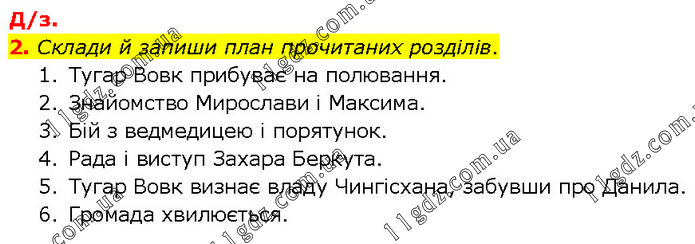 2. Склади й запиши план прочитаних розділів. 1. Тугар Вовк прибуває на полювання. 2. Знайомство Мирослави і Максима. 3. Бій з ведмедицею і порятунок. 4. Рада і виступ Захара Беркута. 5. Тугар Вовк визнає владу Чингісхана, забувши про Данила. 6. Громада хвилюється.