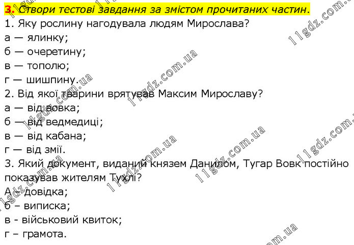 3. Створи тестові завдання за змістом прочитаних частин. 1. Яку рослину нагодувала людям Мирослава? а — ялинку; б — очеретину; в — тополю; г — шишпину. 2. Від якої тварини врятував Максим Мирославу? а — від вовка; б — від ведмедиці; в — від кабана; г — від змії. 3. Який документ, виданий князем Данилом, Тугар Вовк постійно показував жителям Тухлі? А – довідка; б – виписка; в - військовий квиток; г – грамота.