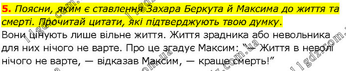 5. Поясни, яким є ставлення Захара Беркута й Максима до життя та смерті. Прочитай цитати, які підтверджують твою думку. Вони цінують лише вільне життя. Життя зрадника або невольника для них нічого не варте. Про це згадує Максим: “— Життя в неволі нічого не варте, — відказав Максим, — краще смерть!”