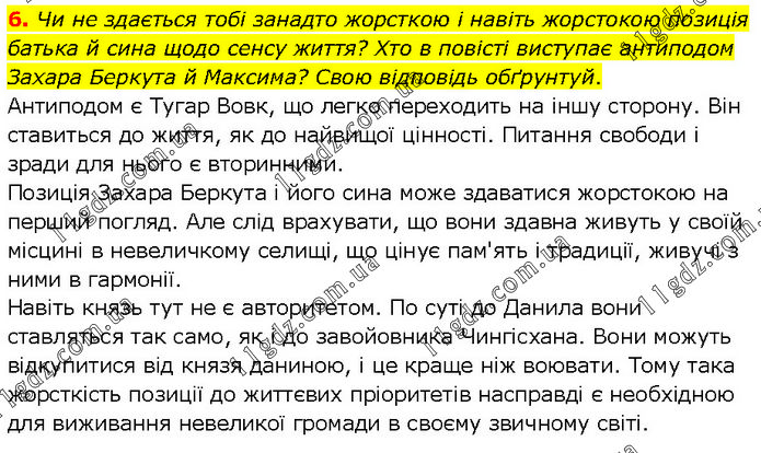 6. Чи не здається тобі занадто жорсткою і навіть жорстокою позиція батька й сина щодо сенсу життя? Хто в повісті виступає антиподом Захара Беркута й Максима? Свою відповідь обґрунтуй. Антиподом є Тугар Вовк, що легко переходить на іншу сторону. Він ставиться до життя, як до найвищої цінності. Питання свободи і зради для нього є вторинними. Позиція Захара Беркута і його сина може здаватися жорстокою на перший погляд. Але слід врахувати, що вони здавна живуть у своїй місцині в невеличкому селищі, що цінує пам'ять і традиції, живучі з ними в гармонії. Навіть князь тут не є авторитетом. По суті до Данила вони ставляться так само, як і до завойовника Чингісхана. Вони можуть відкупитися від князя даниною, і це краще ніж воювати. Тому така жорсткість позиції до життєвих пріоритетів насправді є необхідною для виживання невеликої громади в своєму звичному світі.